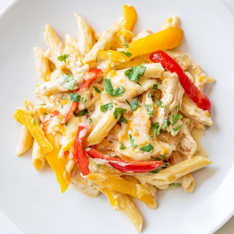 Pin It My neighbor knocked on the door one Thursday holding three bell peppers from her garden, all slightly misshapen but brilliantly colored. I had chicken thawing and pasta in the pantry, and suddenly this skillet came together with whatever fajita spices I could scrounge from the back of the cupboard. The kitchen smelled like a street taco stand within minutes, and my family circled the stove like moths to a flame. It's been our Thursday tradition ever since, though now I buy the peppers myself.