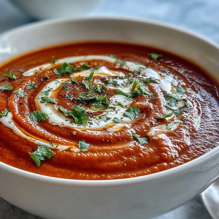 Pin It There's something almost meditative about watching red peppers transform under the oven's heat, their skin blistering and darkening while the kitchen fills with sweet, caramelized warmth. I discovered this soup entirely by accident one autumn evening when I had four glossy red peppers sitting on my counter and no real plan beyond roasting them. What started as improvisation became a ritual, something I've made dozens of times since because it tastes like comfort and sophistication all at once.