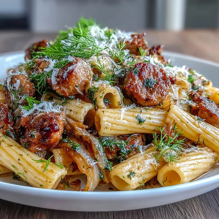 Serve the pasta immediately with an extra sprinkling of Parmesan cheese and fresh herbs. This dish pairs excellently with a crisp Italian white wine, such as Pinot Grigio, to balance the rich flavors of the sausage.